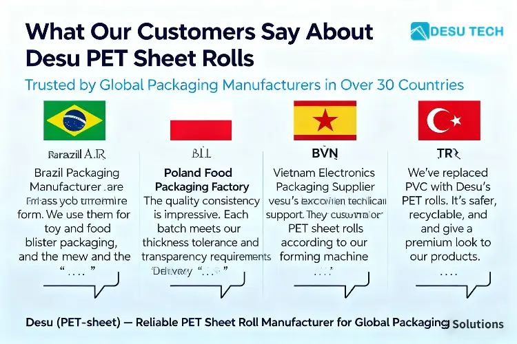 At Desu (PET-sheet), customer satisfaction is our top priority. Over the years, our PET sheet rolls have received positive feedback from clients across Europe, South America, the Middle East, and Southeast Asia. Customers appreciate our stable quality, excellent transparency, and reliable service.